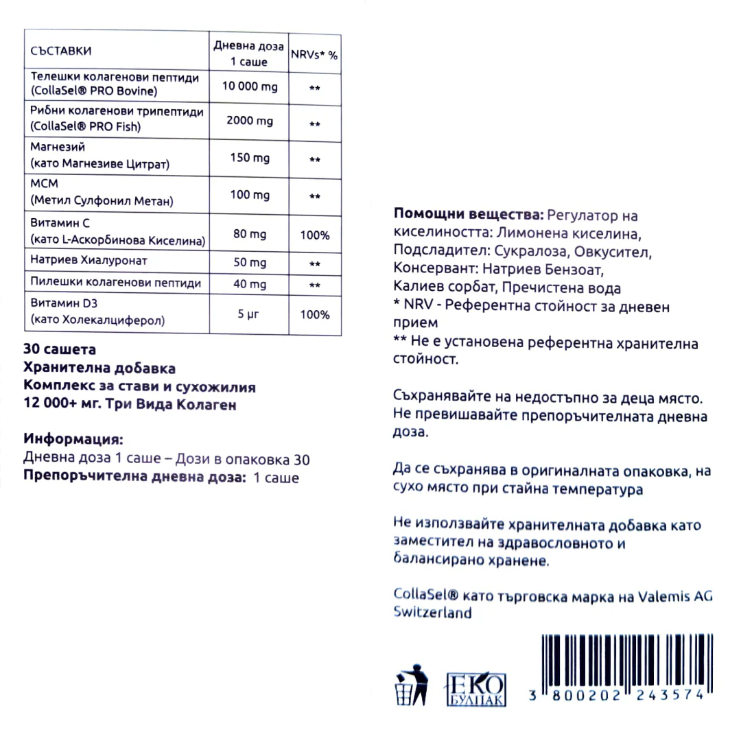 Продуктът комбинира три вида колагенови пептиди: 10 000 mg CollaSel® PRO Bovine пептиди, 2 000 mg CollaSel® PRO Fish трипептиди и 40 mg пилешки колагенови пептиди, с витамини и минерали, които работят в синергия за възстановяване и поддържане оптималното състояние на опорно-двигателния апарат. Всяко саше съдържа висококонцентрирани съставки за максимално усвояване и ефективност.